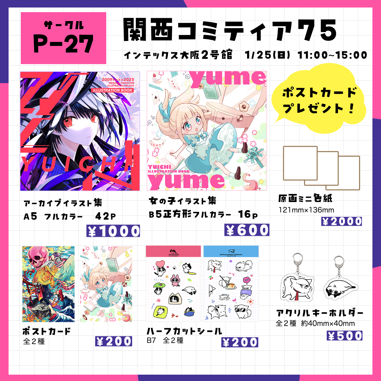 2026.01.18 お知らせ 関西コミティア75 お品書き 関西コミティア75にサークル参加させていただきます。 コミティアは初めてなので緊張します! イラスト集にポストカードがついてきます! お立ち寄りいただいた方におまけのシールをプレゼント予定です! 去年末にバタバタしており、追加のグッズや本などは用意ができなかったのですがTT 本当に暇していると思うので…サンプルだけでも見に来てください〜 よろしくお願いいたします!PR